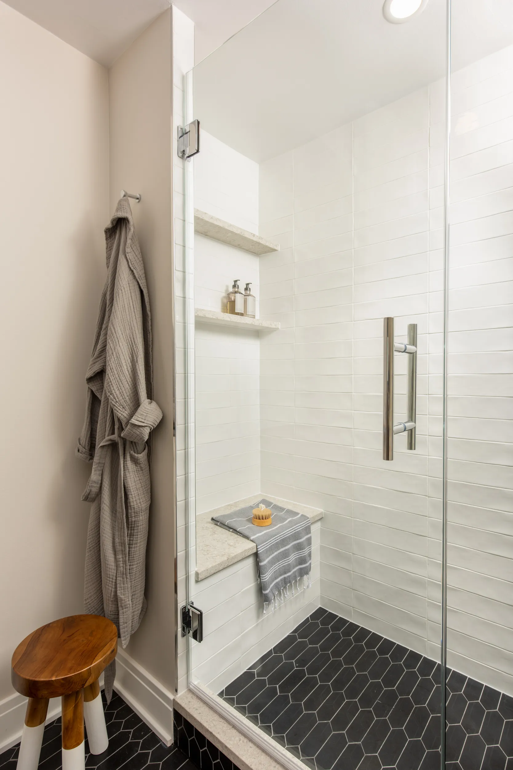 Minimalist guest bathroom featuring a sleek glass shower, hexagonal black tiles, and a wooden stool. Subtle built-in shelving complements the design.