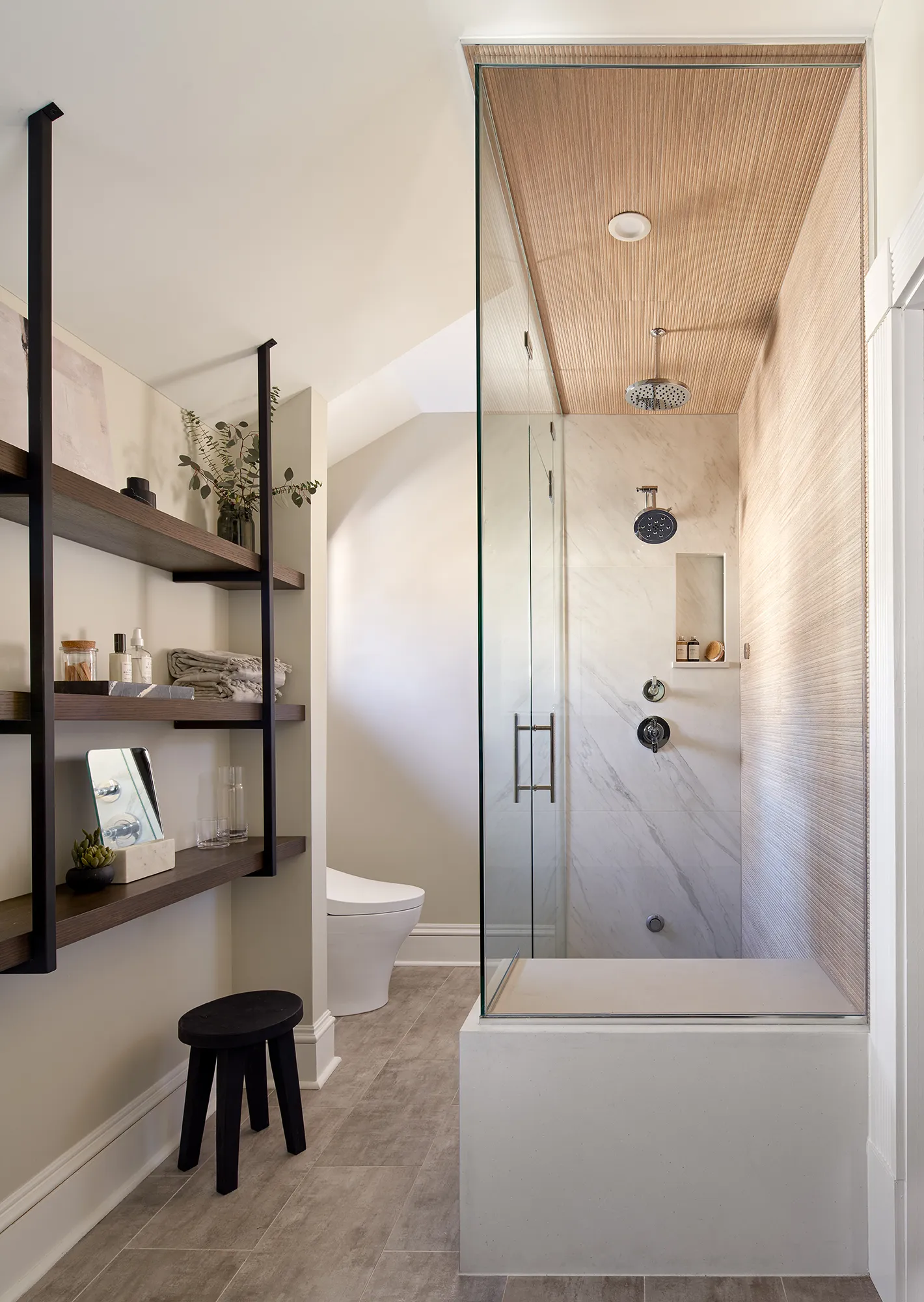 Minimalist primary bathroom with sleek glass shower, marble accents, and wooden stool. Neutral tones enhance the serene ambiance and architectural elegance.