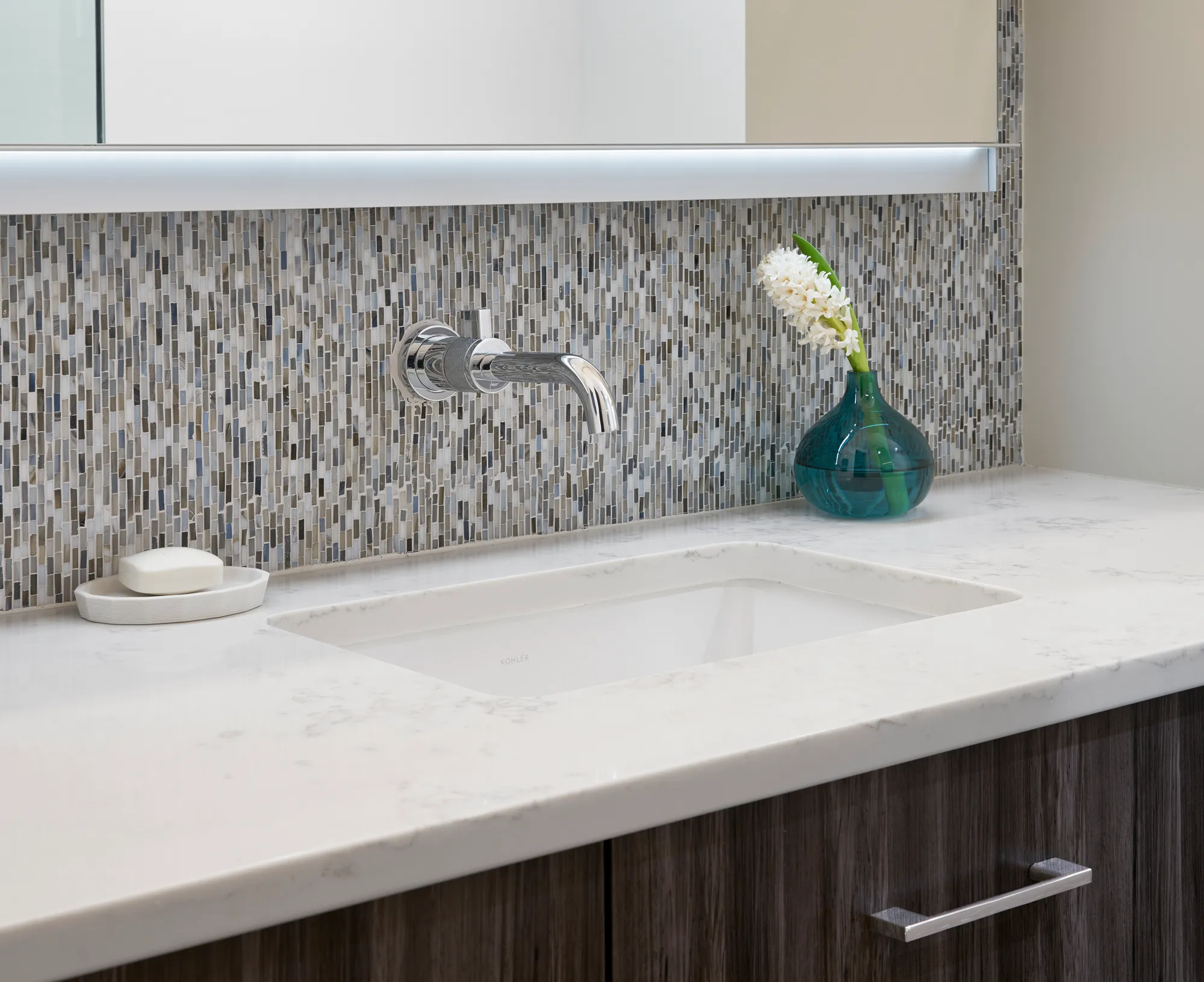 Contemporary bathroom with mosaic tile backsplash, sleek wall-mounted faucet, and elegant marble countertop enhances modern design aesthetics.