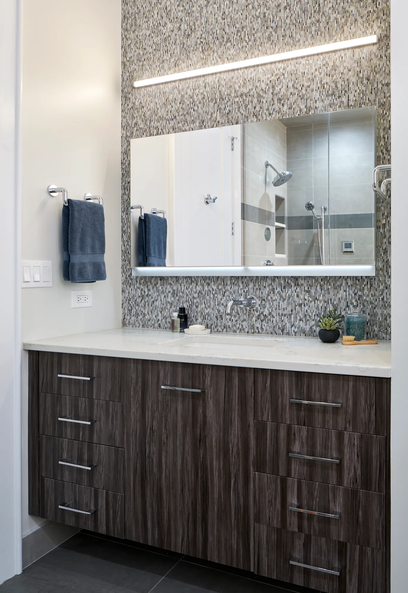 Contemporary bathroom with sleek wood cabinetry, mosaic tile backsplash, minimalist mirror, and modern fixtures, embodying sophisticated design.