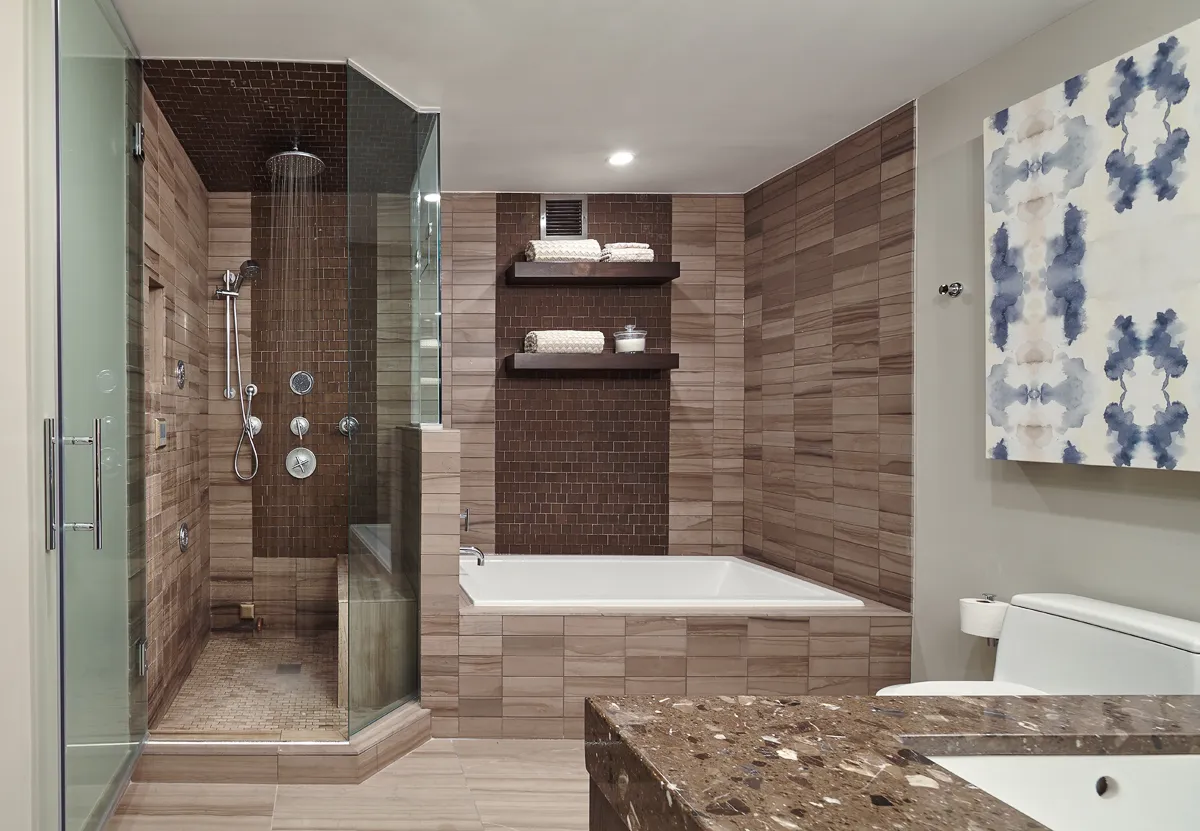 Contemporary primary bathroom with sleek glass shower, elegant tile walls, luxurious soaking tub, and modern art accentuating the stylish space.