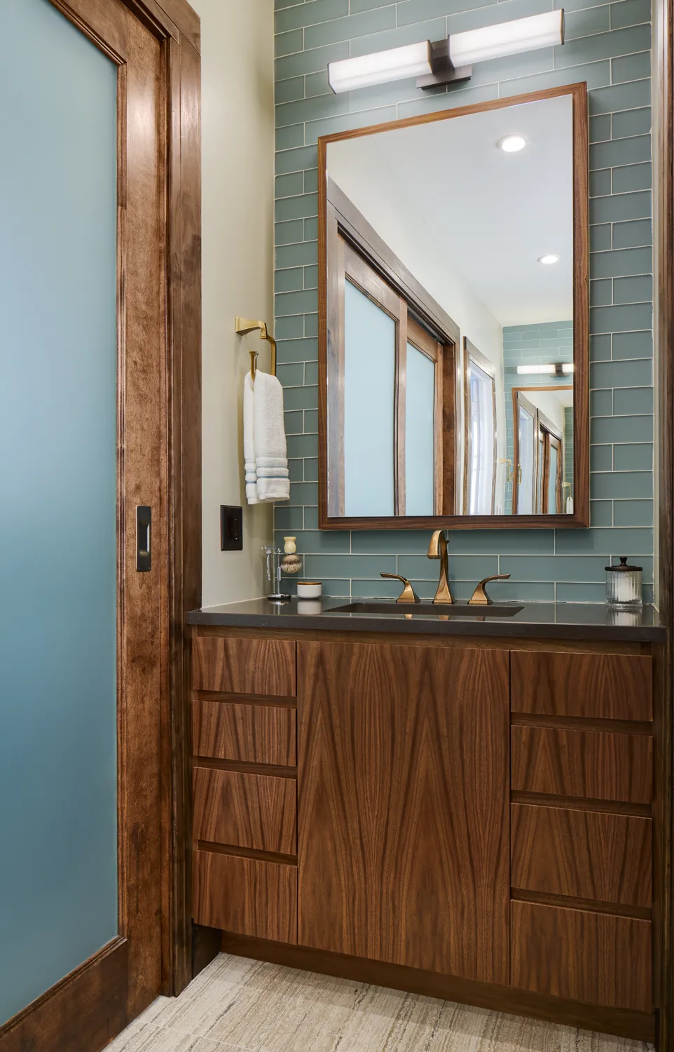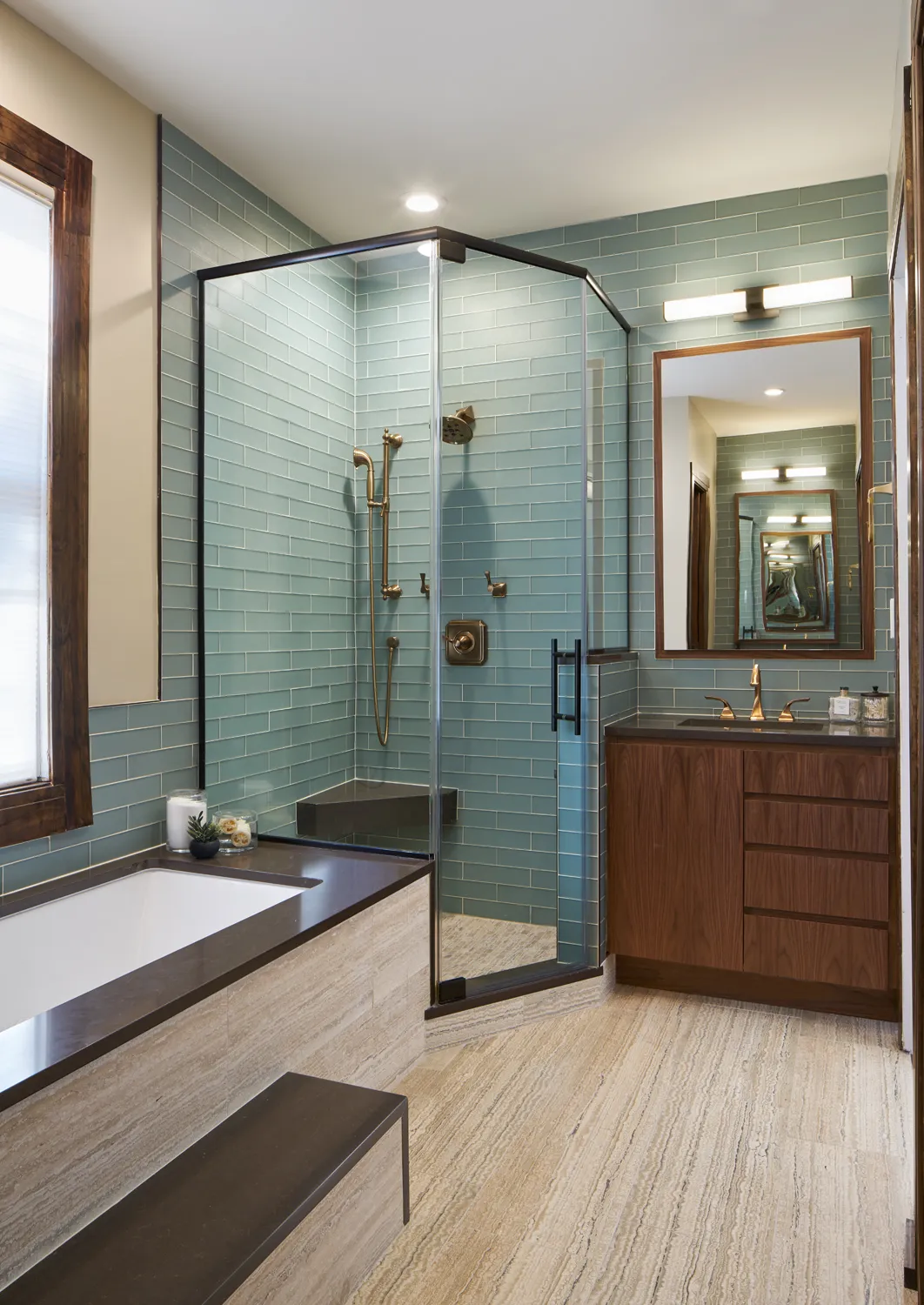 Mid-century modern primary bathroom with teal subway tiles, glass shower, wood vanity, and sleek lighting, enhancing architectural elegance.