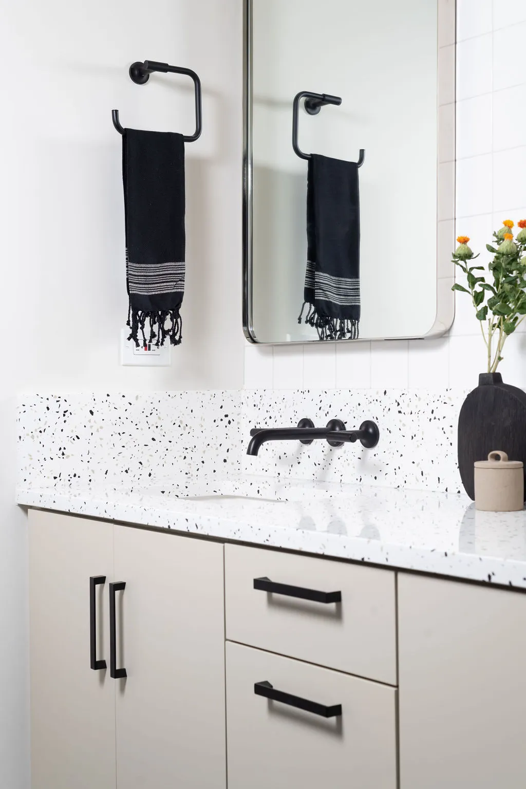 Contemporary primary bathroom featuring a terrazzo countertop, sleek black fixtures, and a minimalist mirror, accented by elegant cabinetry and modern decor.