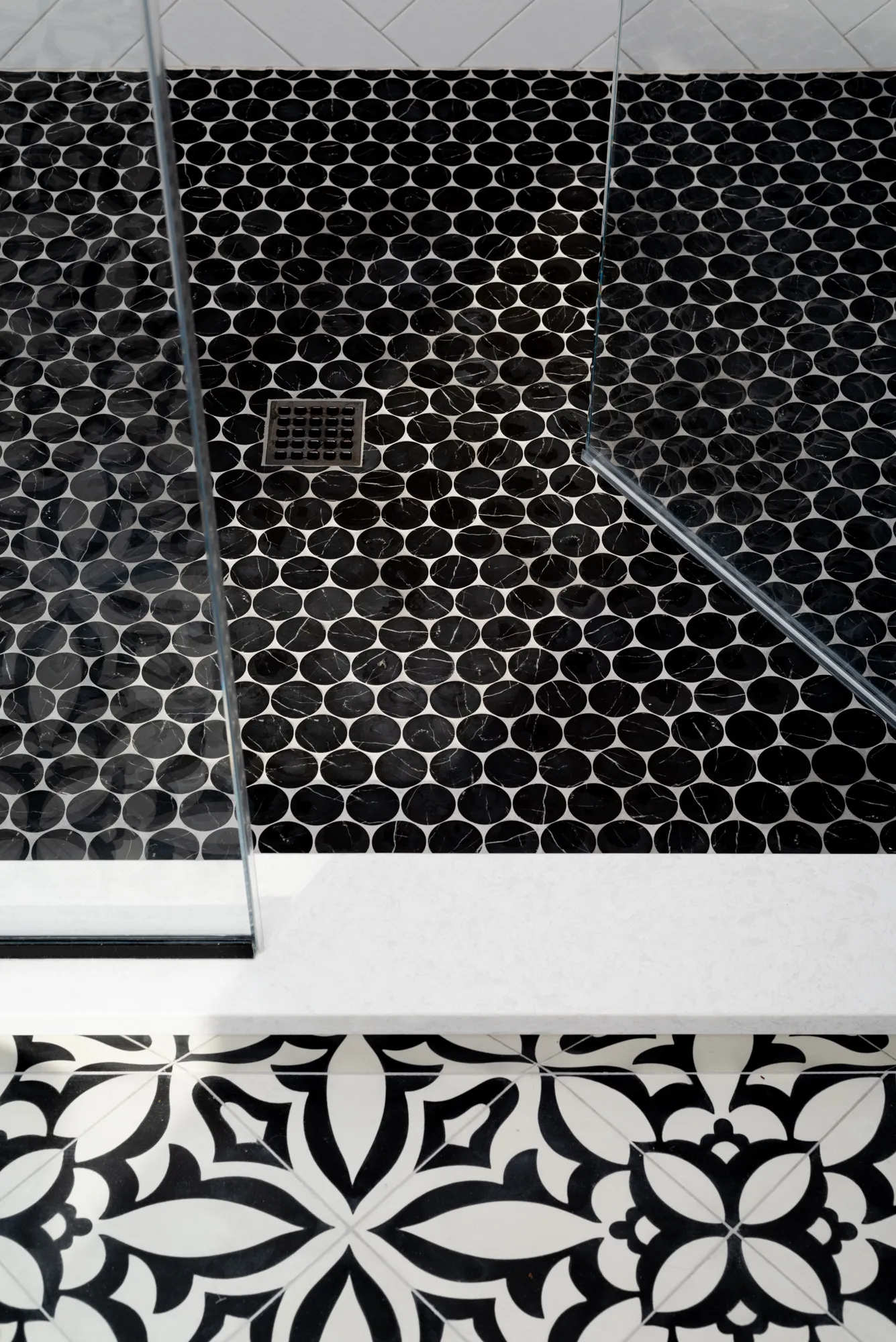 Contemporary primary bathroom with striking black circular tile floor and intricate black-and-white geometric wall patterns, enclosed in sleek glass.