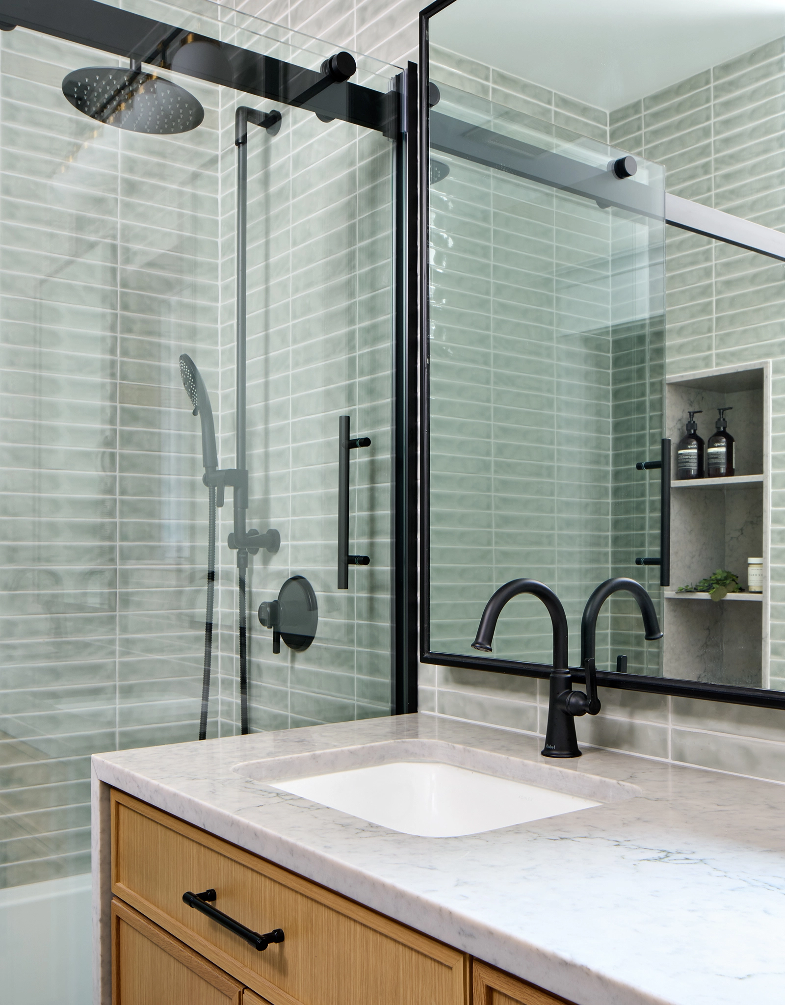 Minimalist primary bathroom featuring sleek, green tile walls, marble niche shelves, and a modern glass shower door with a black handle.