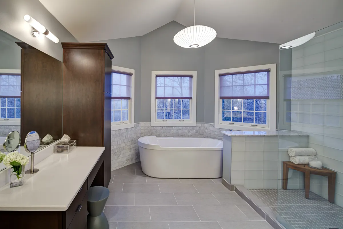 Minimalist primary bathroom with sleek fixtures, geometric shower design, abundant natural light, and subtle modern accents.