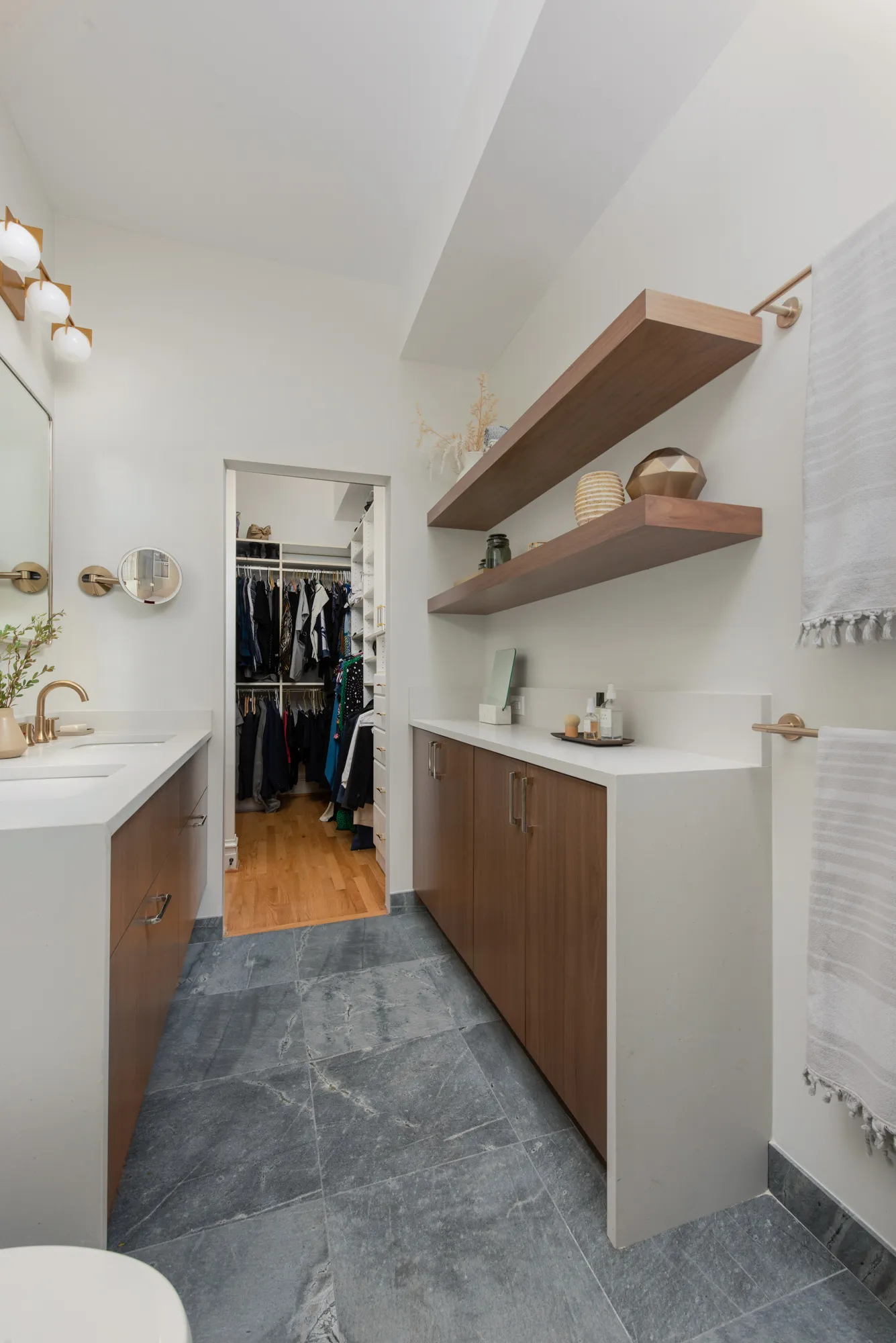 Minimalist primary bathroom with sleek cabinetry, floating shelves, gray stone flooring, and stylish fixtures, leading to a walk-in closet.