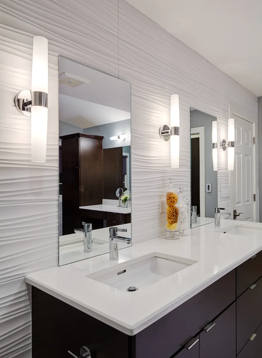 Contemporary primary bathroom with textured walls, sleek vanity, integrated lighting, and modern fixtures for a sophisticated look.