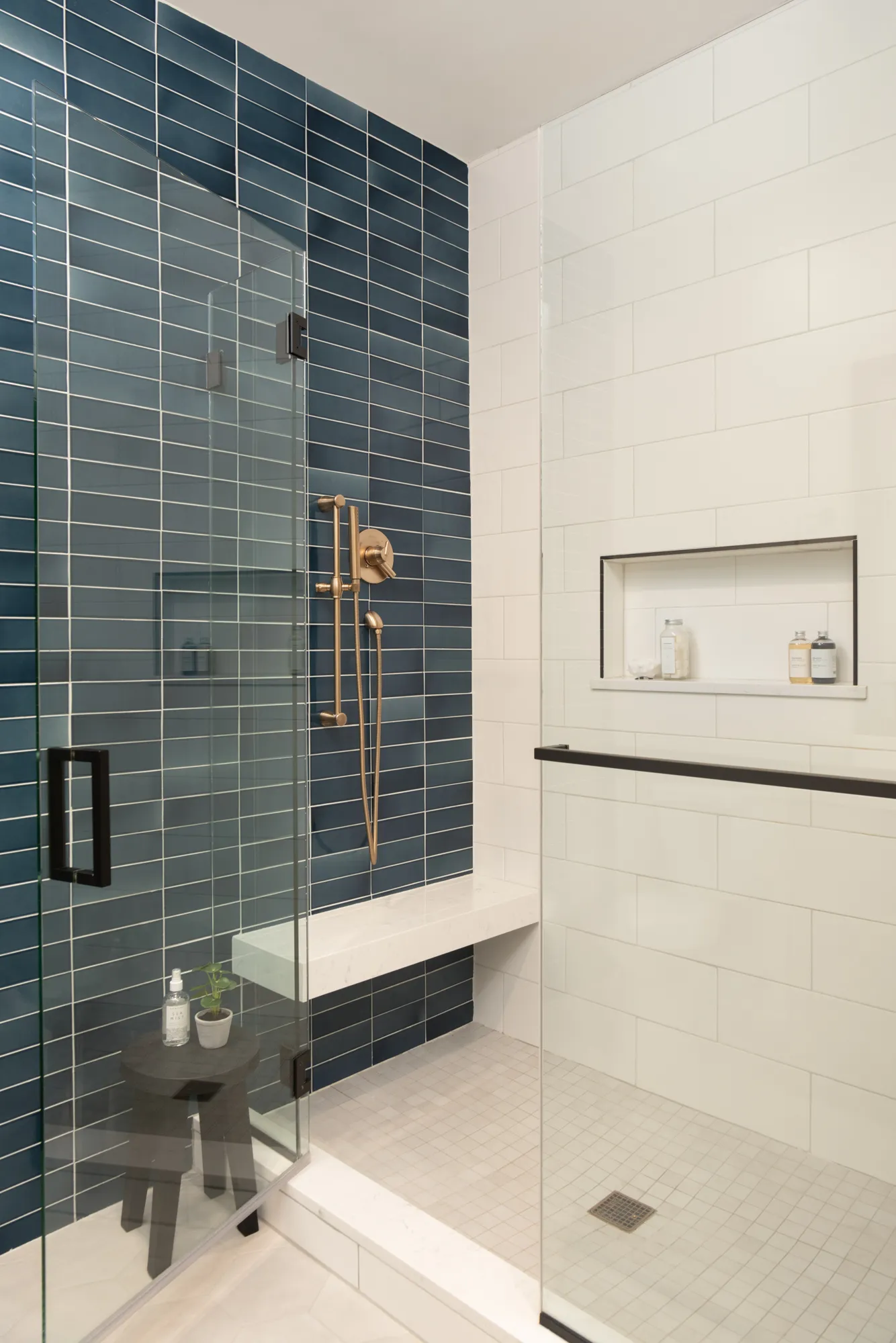 Contemporary primary bathroom with elegant glass shower, striking blue tile wall, and built-in niche. White tiles and brass fixtures enhance modernity.