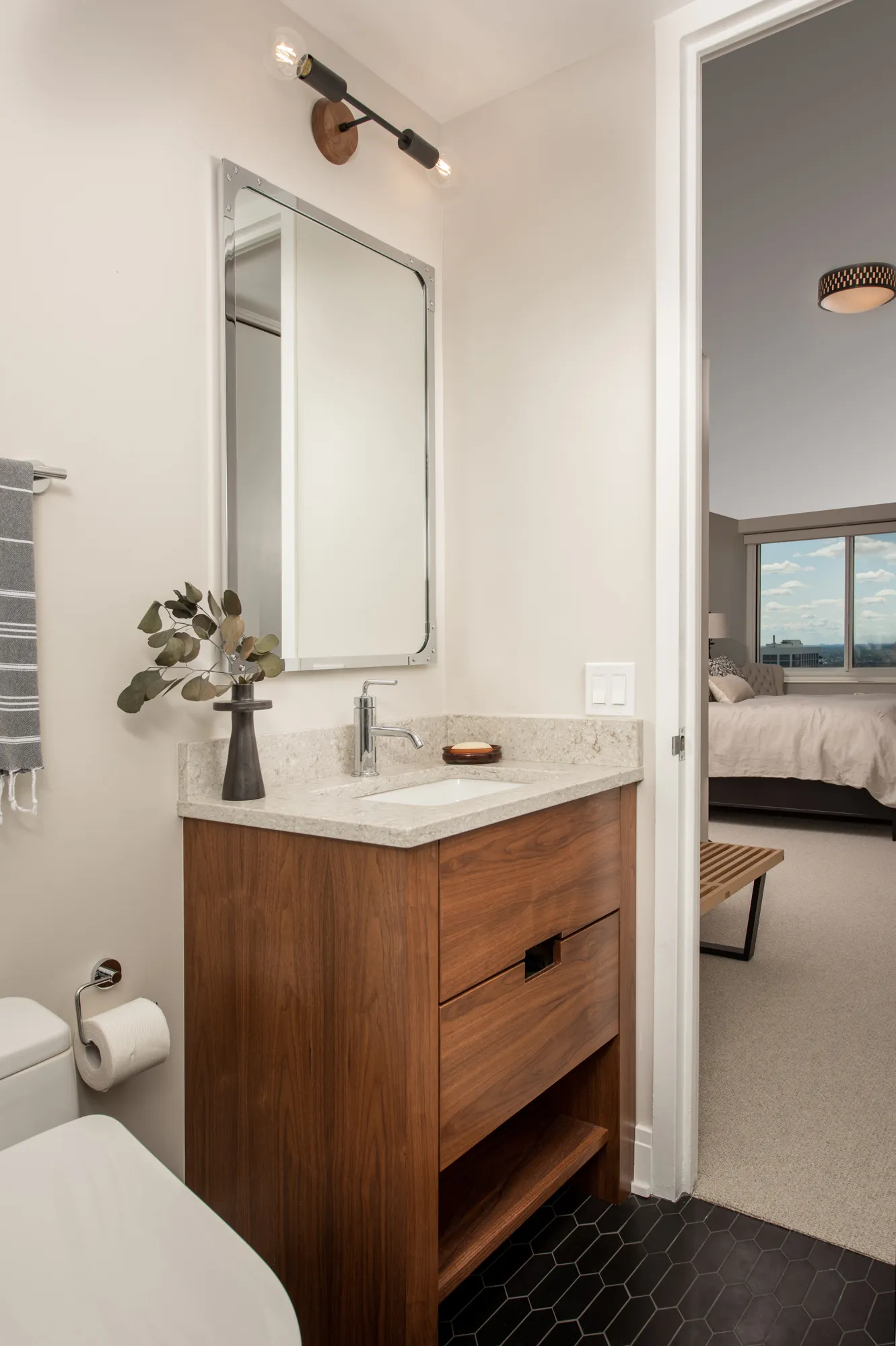 Modern guest bathroom with sleek wood vanity, hexagonal floor tiles, minimalist mirror, and stylish lighting, creating an elegant, airy ambiance.