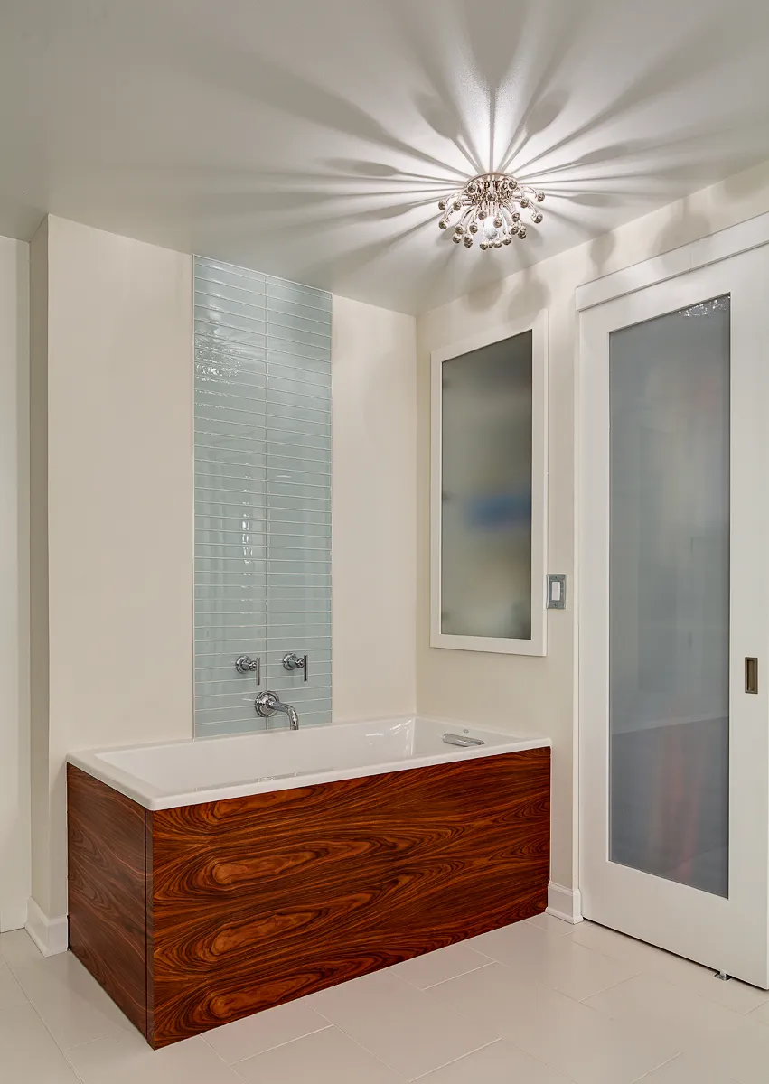 Contemporary bathroom featuring wood-paneled bathtub, frosted glass doors, and sleek tile accents. Elegant lighting enhances the modern aesthetic.