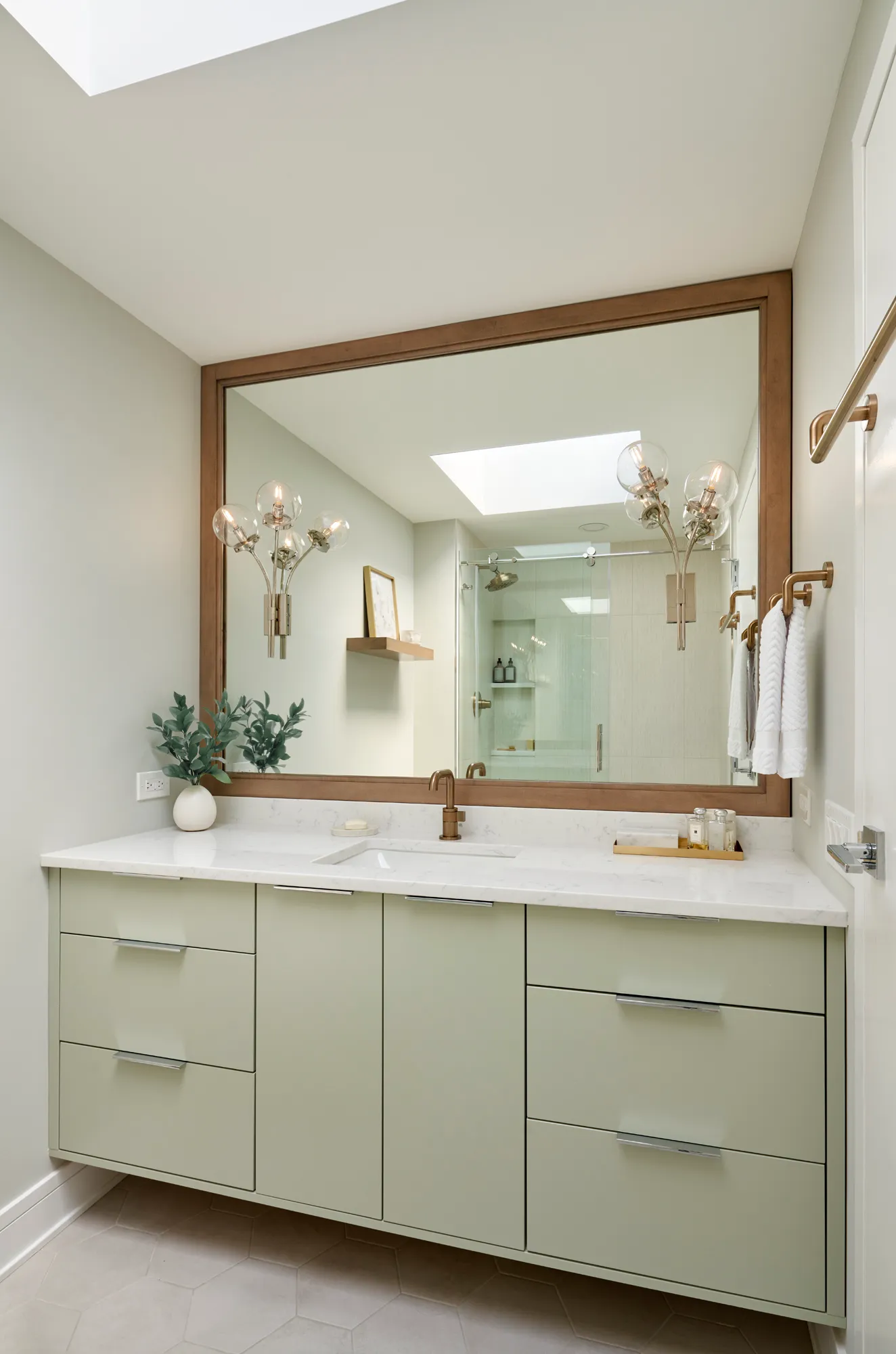 Contemporary primary bathroom with sleek cabinetry, large mirror, elegant sconces, skylight, and glass shower. Modern design with clean architectural lines.