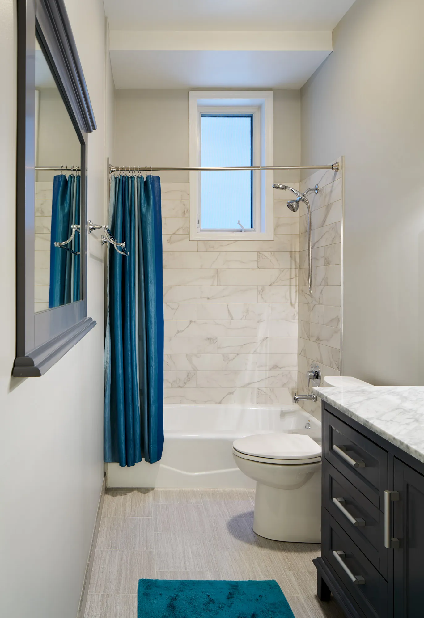 Contemporary bathroom with marble tiles, sleek glass shower, vibrant blue curtain, elegant vanity, large mirror, and minimalist window.