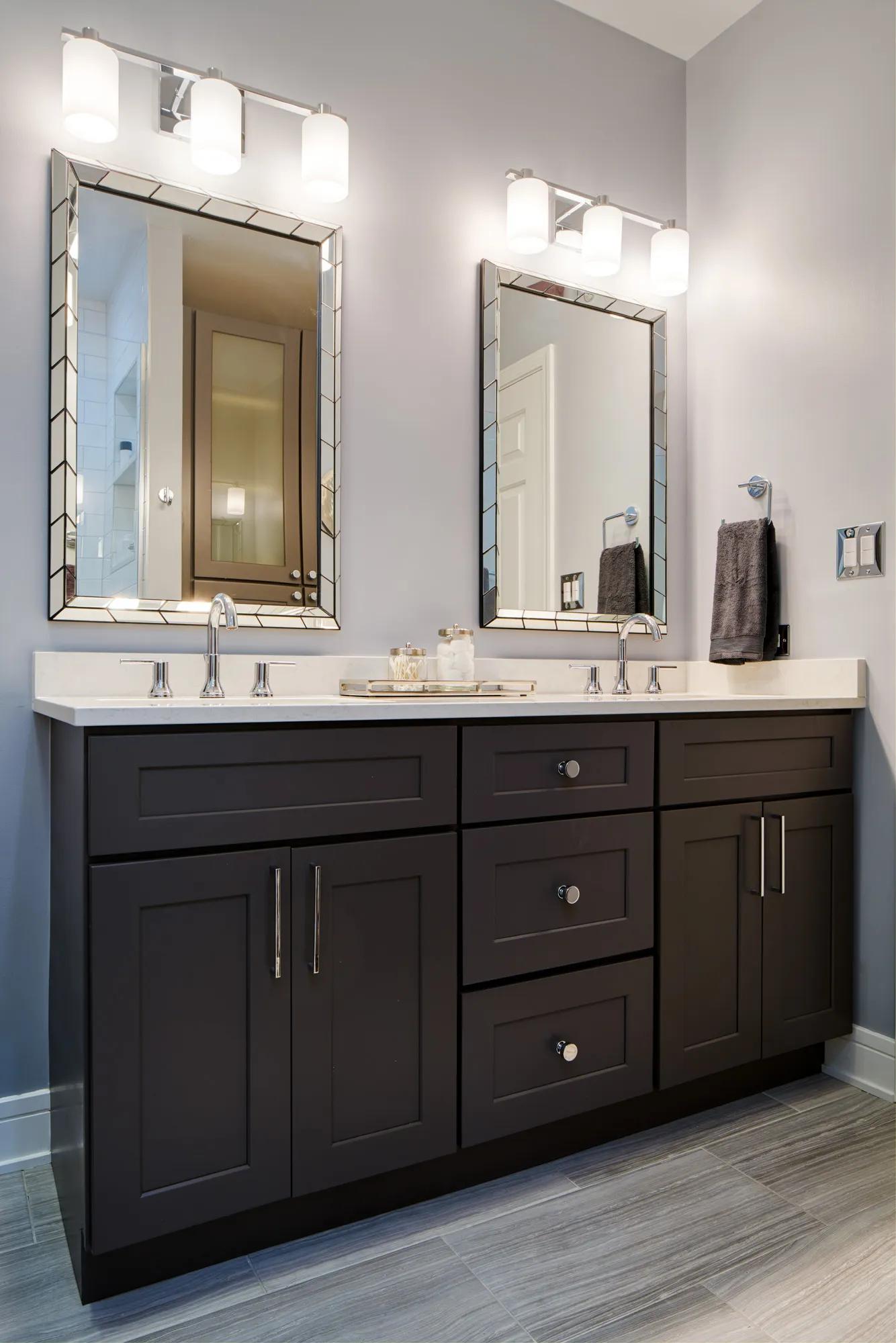 Contemporary primary bathroom with sleek dark cabinetry, unique geometric mirrors, and stylish lighting fixtures, exuding modern elegance and functionality.