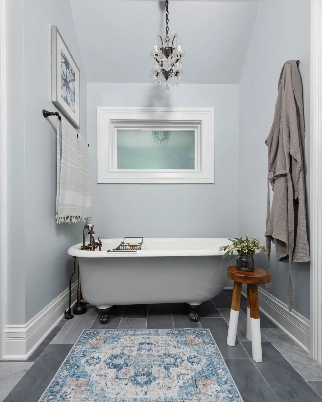 Traditional primary bathroom featuring clawfoot tub, elegant chandelier, framed window, ornate rug, and classic decor accents.