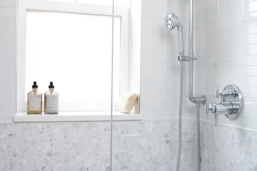 Minimalist bathroom with sleek chrome fixtures, terrazzo surfaces, glass shower, and natural light from a large window. Clean, modern design.