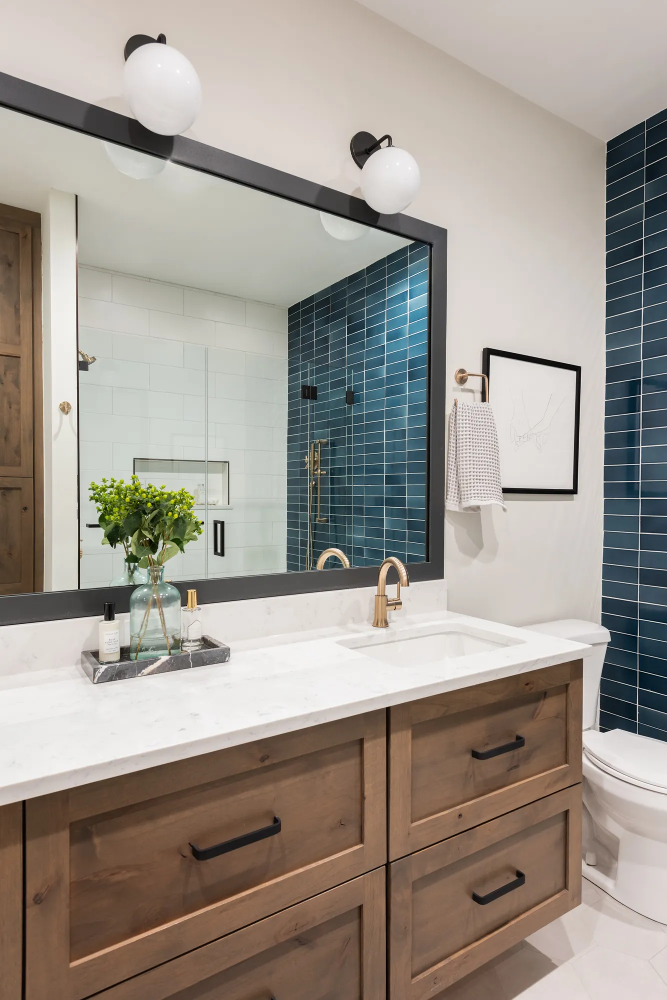 Contemporary guest bathroom with dual mirrors, sleek vanity, blue tile accent wall, and chic lighting. Natural light highlights modern design elements.