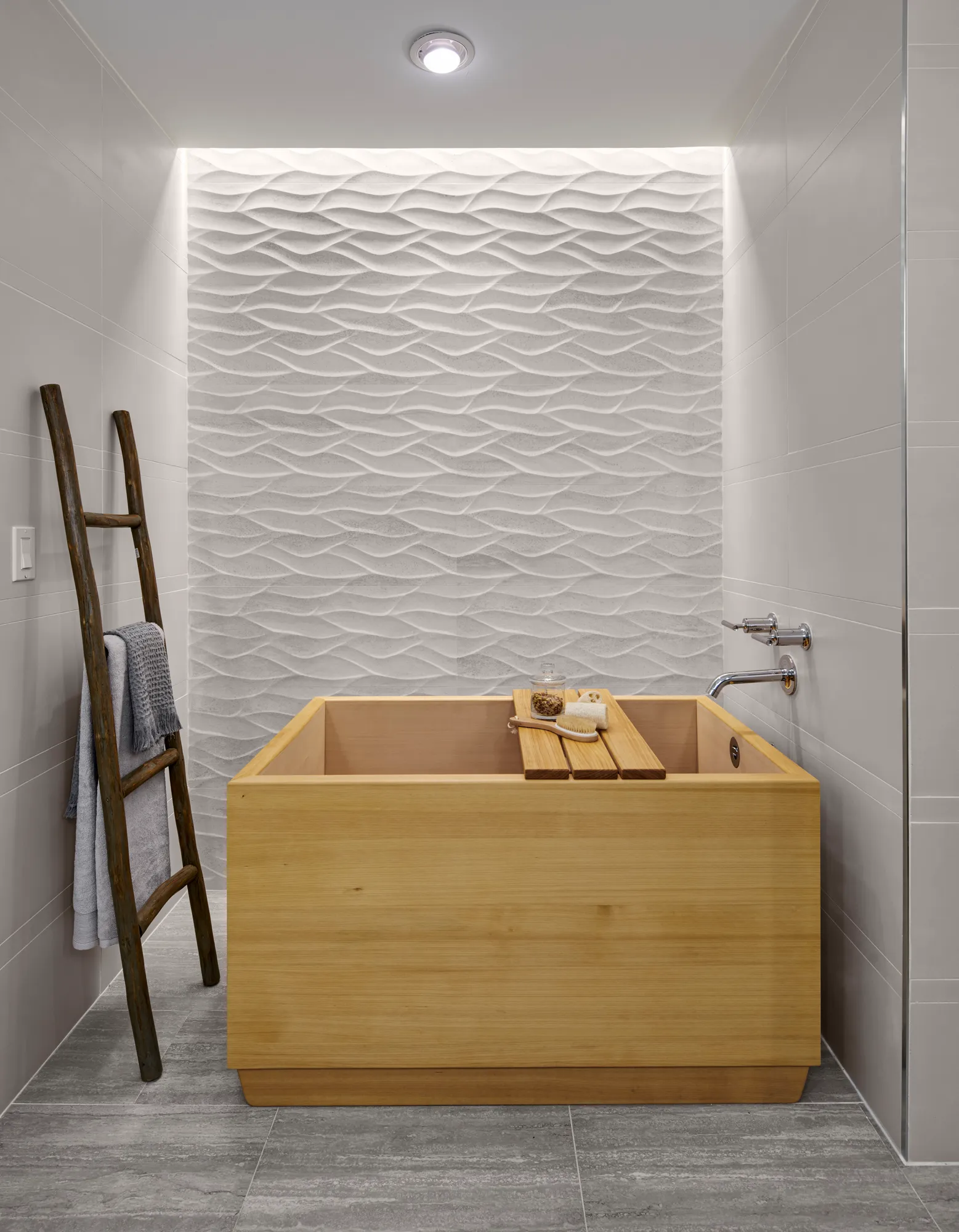 Zen primary bathroom showcasing a wooden soaking tub, wave-patterned tiles, and a minimalist ladder towel rack for a serene atmosphere.