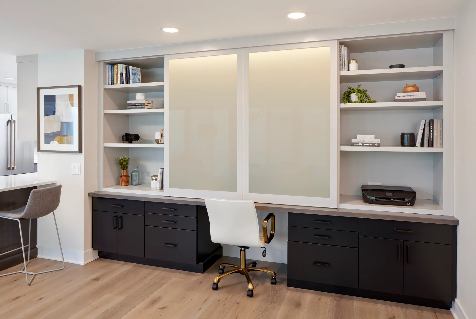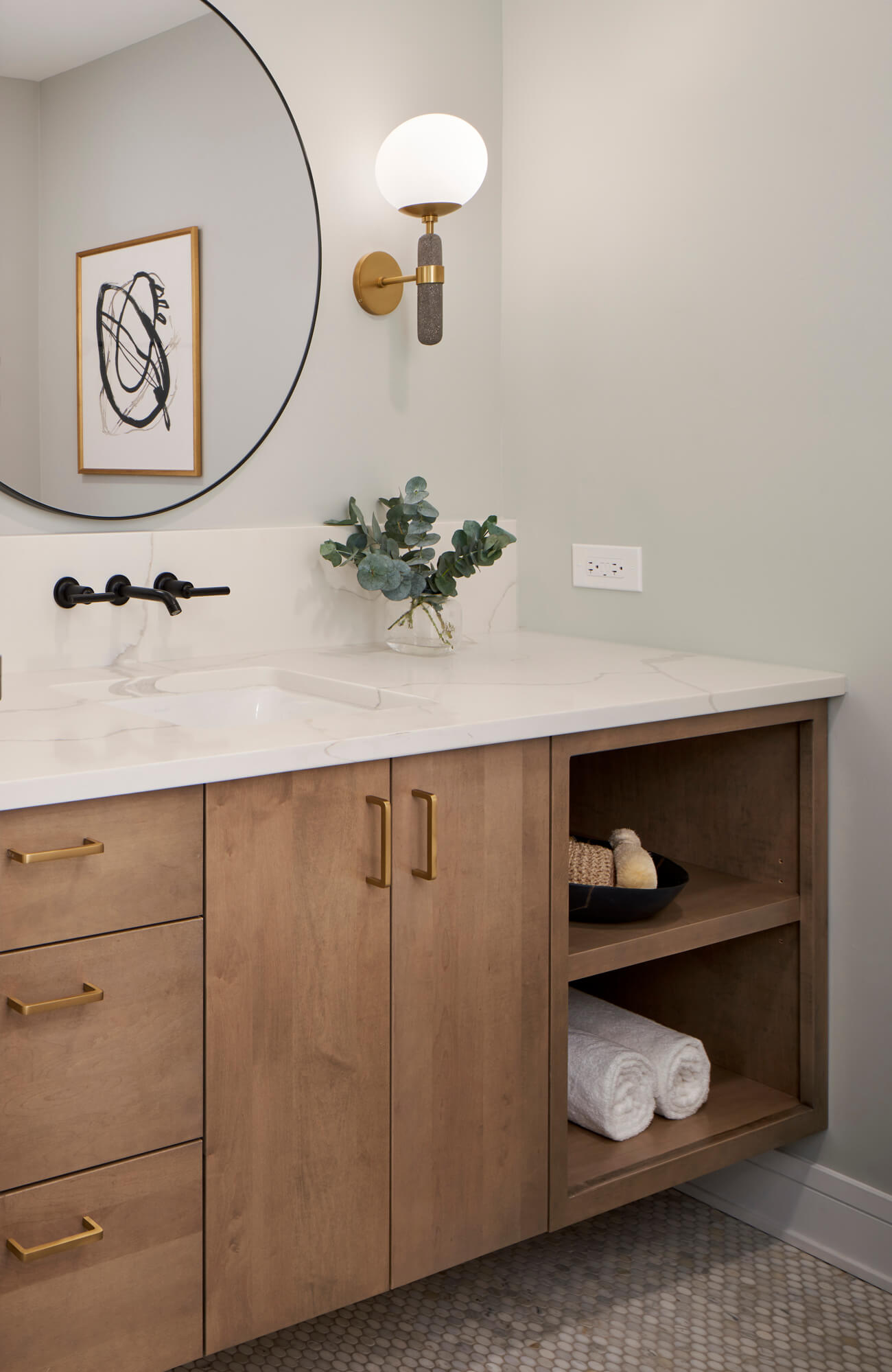 This home has a clean, modern look that feels both comfortable and practical. The client preferred a calm, neutral palette with warm wood, black, and brass details to create a cohesive feel throughout.