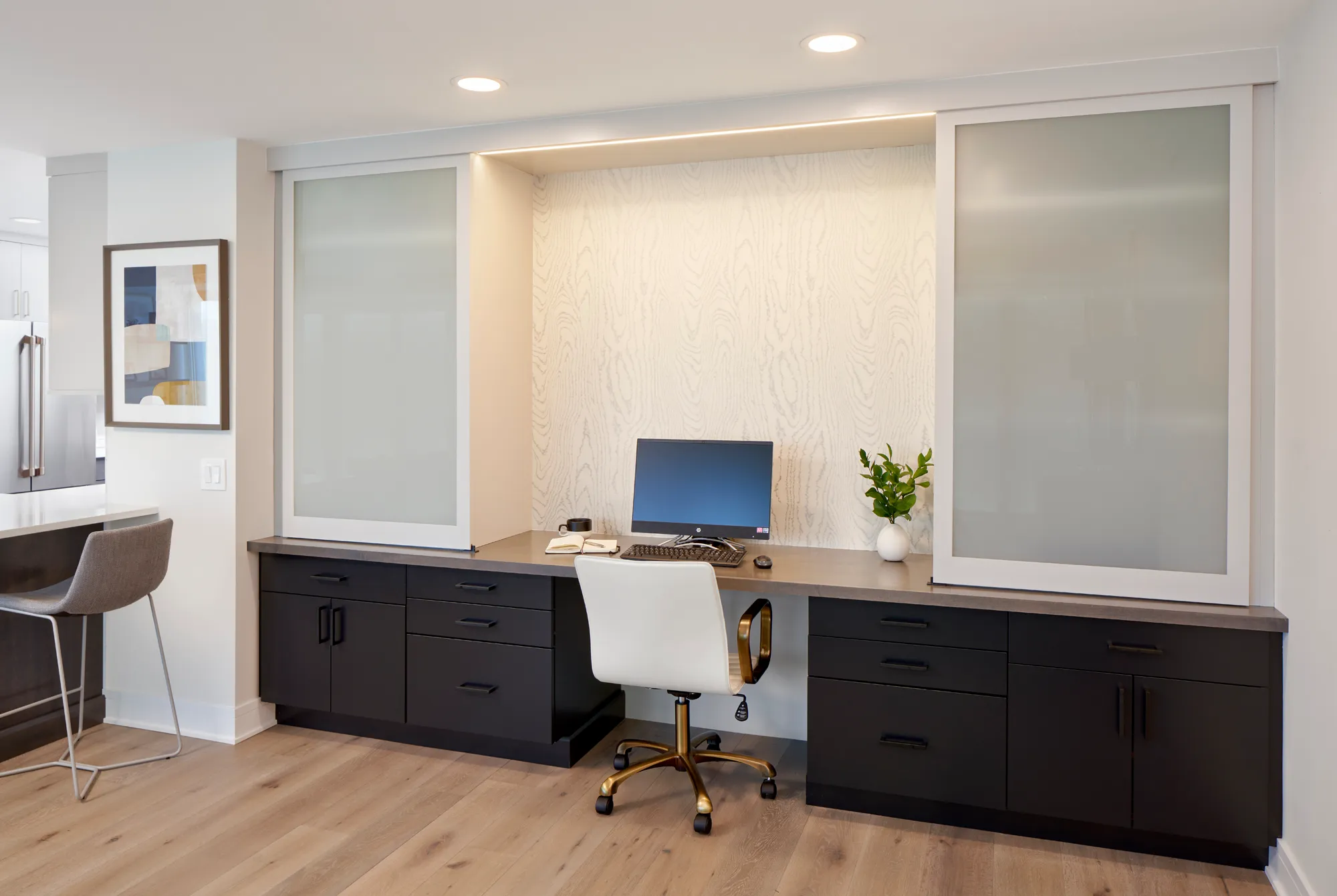 Functionality was important, so the layout includes useful features like open shelving, layered lighting, and a built-in workspace to support daily routines. Each space—from the bedroom and kitchen to the bathrooms and living areas—was put together to be easy to live in while still looking polished and pulled together.