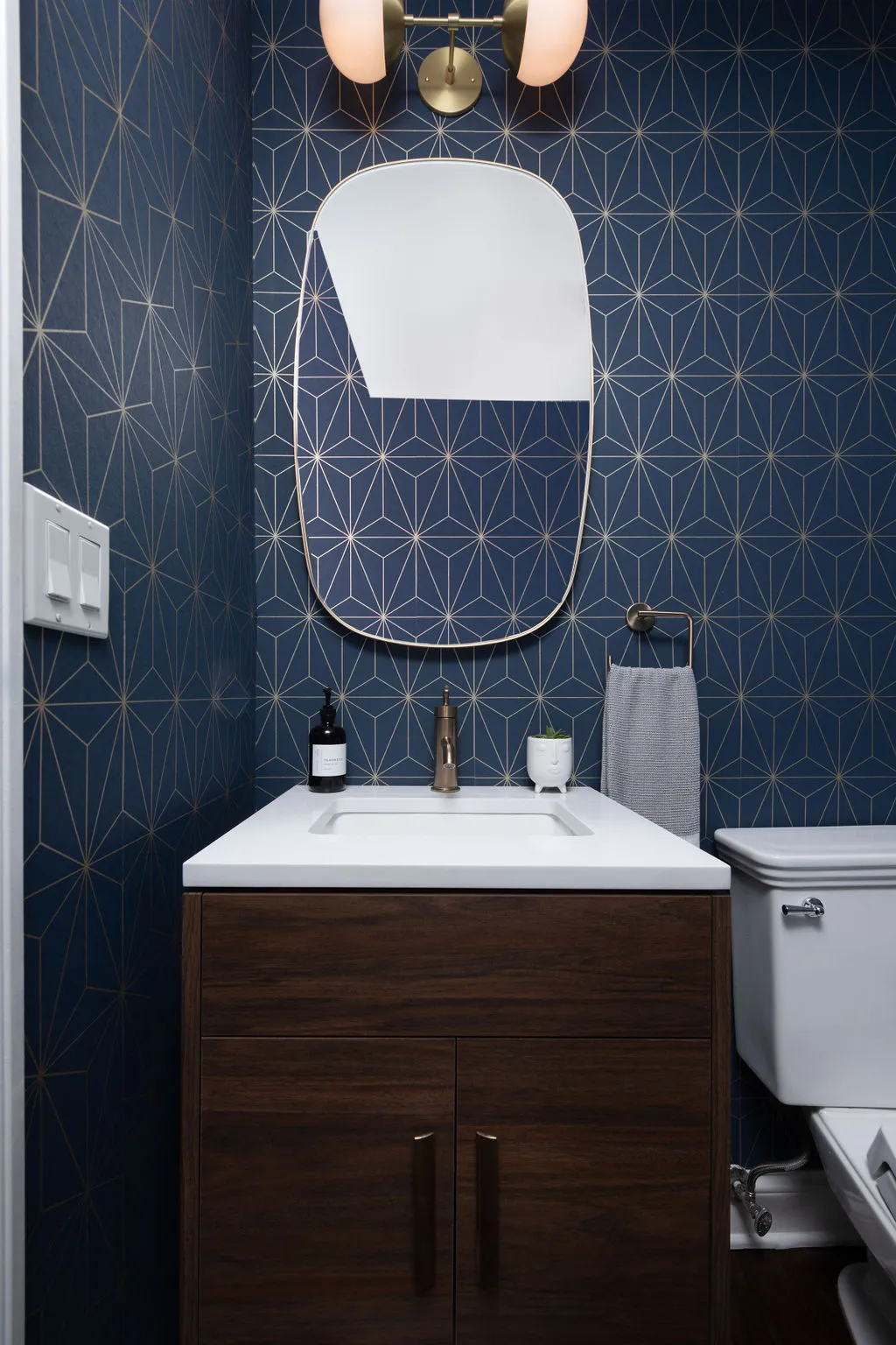 The powder room makes a striking statement with navy geometric wallpaper, brass fixtures, and a minimalist wood vanity.