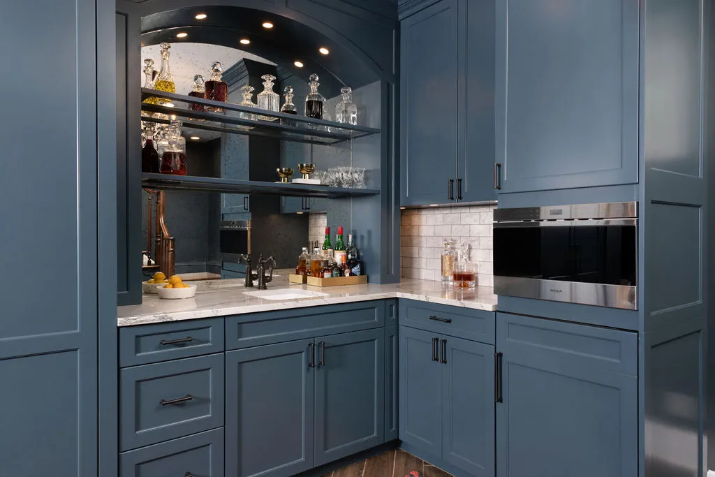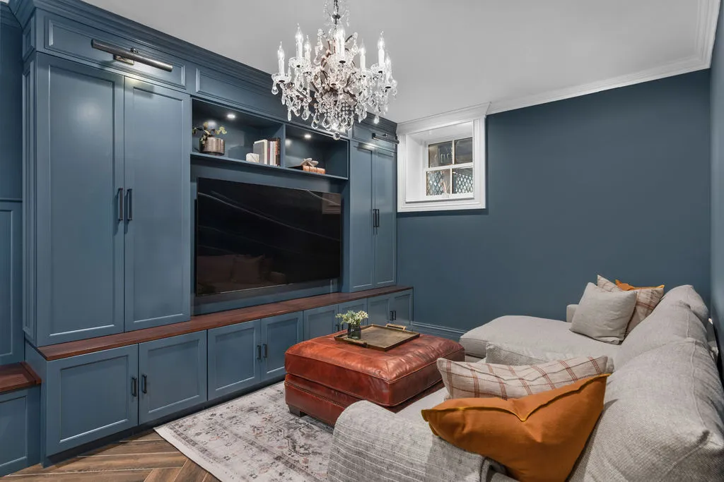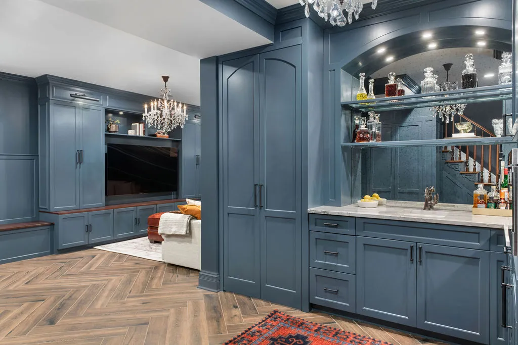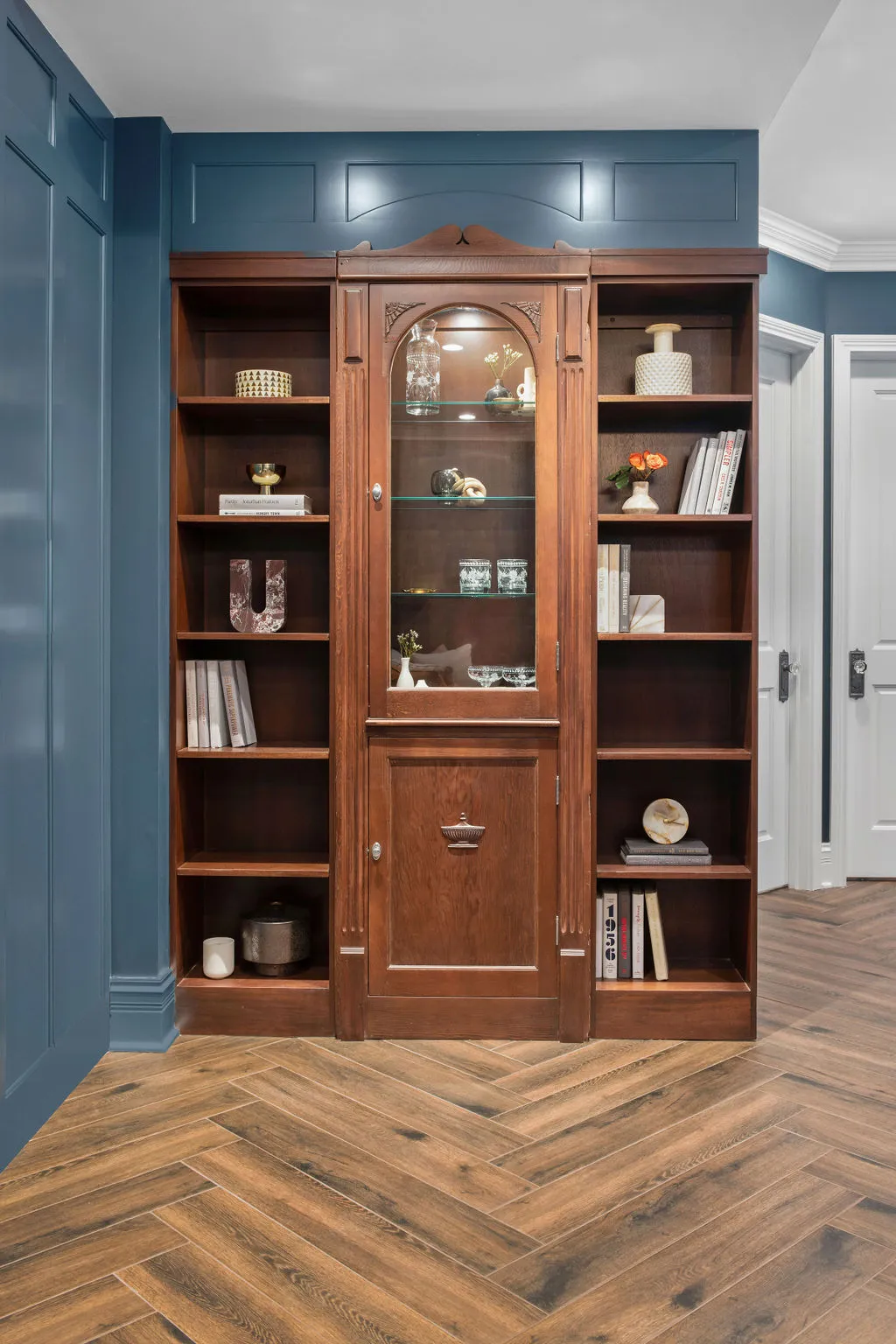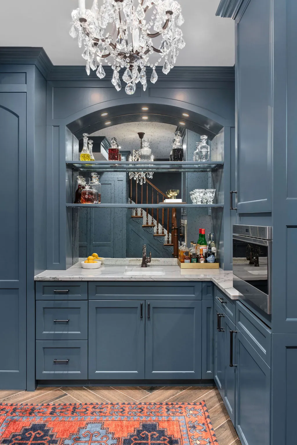Throughout this home, thoughtful details carry a sense of continuity from room to room. The space is balanced by lighter finishes—whether it’s a marble countertop, crisp white cabinetry, or a patterned tile floor. Brass and black hardware repeat across spaces, tying together kitchens, bathrooms, and built-ins with subtle consistency.